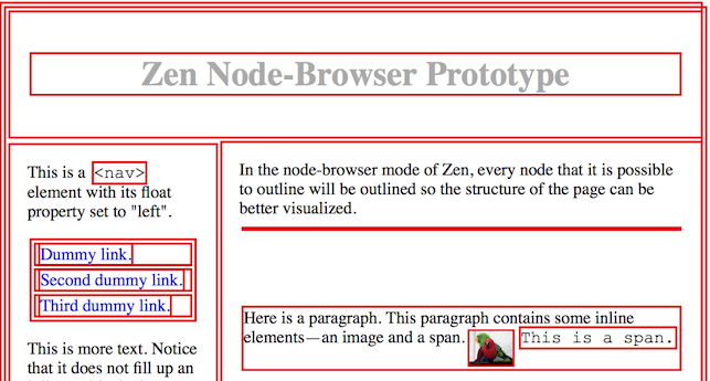Zen will take a different approach. In Zen, HTML elements making up the web page will represent themselves at the top-level view, with all the obscurity of detail that implies. Still, when Zen’s node browser is open, Zen will try to show a picture of the web page with all the all block boxes, inline boxes, and inline-block boxes43 visible. Possibly it will do this by temporarily restyling all borders and margins (Figure 7).